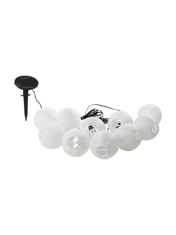 Denne solcelle-lyskæde i lanterne-look i farven hvid afgiver varmt hvidt lys og skaber en hyggelig stemning i din have.